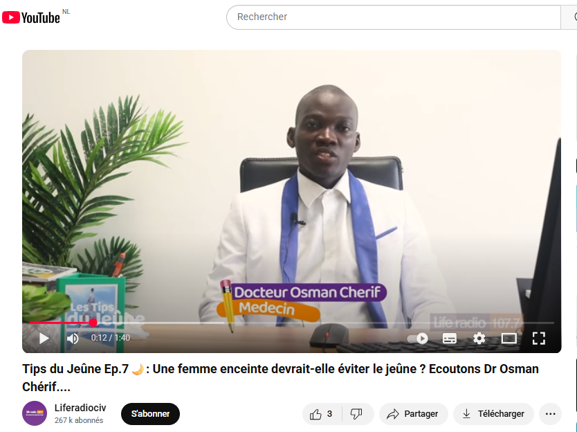 Les images de son intervention ont quant à elles été prélevées d’une vidéo publiée sur le compte YouTube de la chaîne de radio ivoirienne Life Radio. Dans la vidéo originale, le médecin, vêtu des même habits, intervenait dans une émission de 1 minute 40 secondes intitulée “Tips du Jeûne Ep.7 : Une femme enceinte devrait-elle éviter le jeûne ? Écoutons Dr Osman Chérif”. Une thématique qui n’a aucun rapport avec l’arthrite.