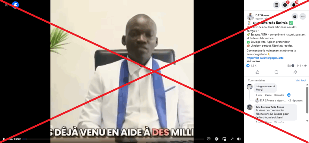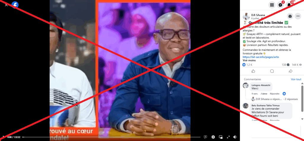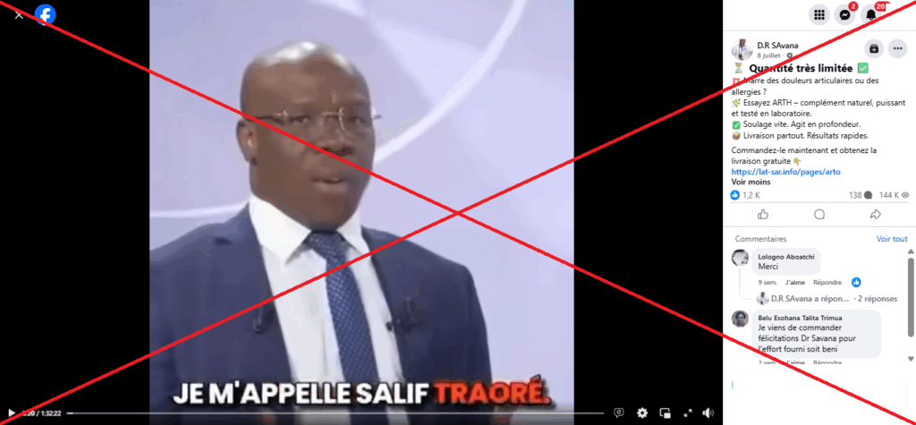 Au 19 septembre 2025, cette vidéo cumulait plus de 144.000 vues, 1257 likes, 138 commentaires et 85 partages. Mais, cette vidéo d’A’salfo est un deepfake, c’est-à-dire, un contenu multimédia falsifié grâce à l’intelligence artificielle. L’artiste n’a fait aucune sortie pour promouvoir un produit contre l’arthrite.