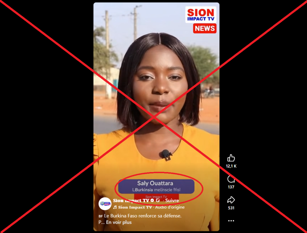 D’abord, le nom de la présentatrice, Saly Ouattara, qui apparaît en bas de l’image, ne correspond à aucune journaliste d’aucun média au Burkina Faso ou ailleurs. De plus, le véhicule militaire censé transporter des missiles dits tactiques ne ressemble pas à un véritable engin, capable de rouler correctement comme le ferait un véhicule normal sur une route.
