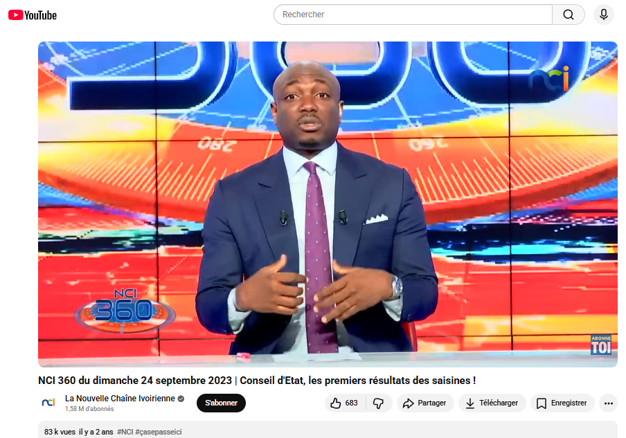 Une autre recherche sur YouTube à partir des mots clés en lien avec la chaîne NCI, la mention 360 et la 78e AG des Nations unies a permis d’accéder à l’intégralité de l’émission de laquelle est extraite la vidéo que nous vérifions. L’émission, est intitulée “NCI 360 du dimanche 24 septembre 2023 | Conseil d’État, les premiers résultats des saisines !” Elle est diffusée le 25 septembre 2025 sur la page Youtube de NCI et dure 1 heure 54 minutes.