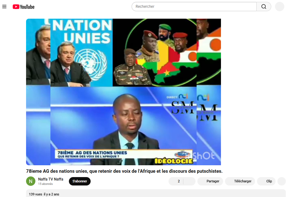 Une recherche inversée d’image de la capture d’écran de cette vidéo avec l’outil InVid a conduit vers la chaîne Youtube Naffa TV Naffa qui a publié le 26 septembre 2023 un extrait de cette vidéo. Cette version plus longue, de 6 minutes et 35 secondes est titrée : 78ieme AG des Nations unies, que retenir des voix de l’Afrique et les discours des putschistes.