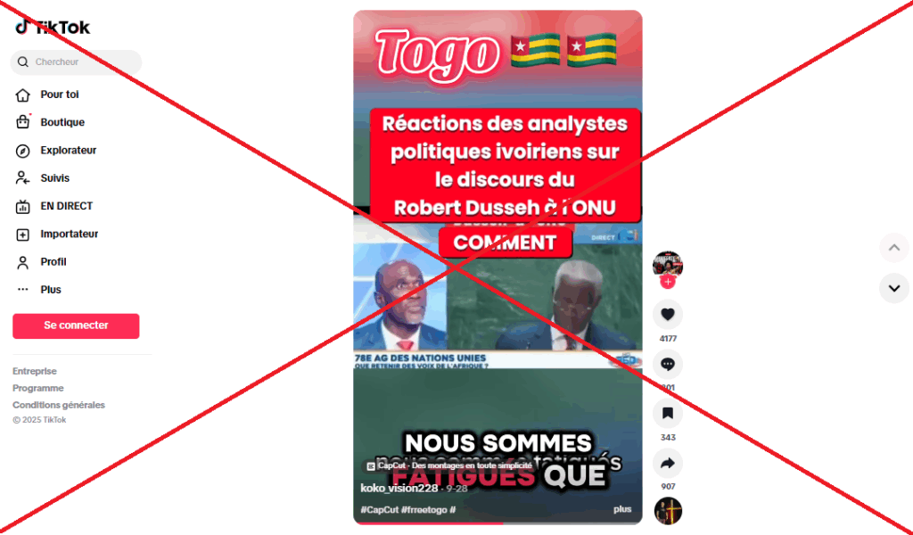 Une vidéo diffusée sur TikTok tente de faire croire que des analystes ivoiriens ont réagi au discours prononcé par le ministre des affaires étrangères du Togo Robert Dussey à l’Assemblée générale des Nations-unies tenue du 9 au 29 septembre 2025 à New York.