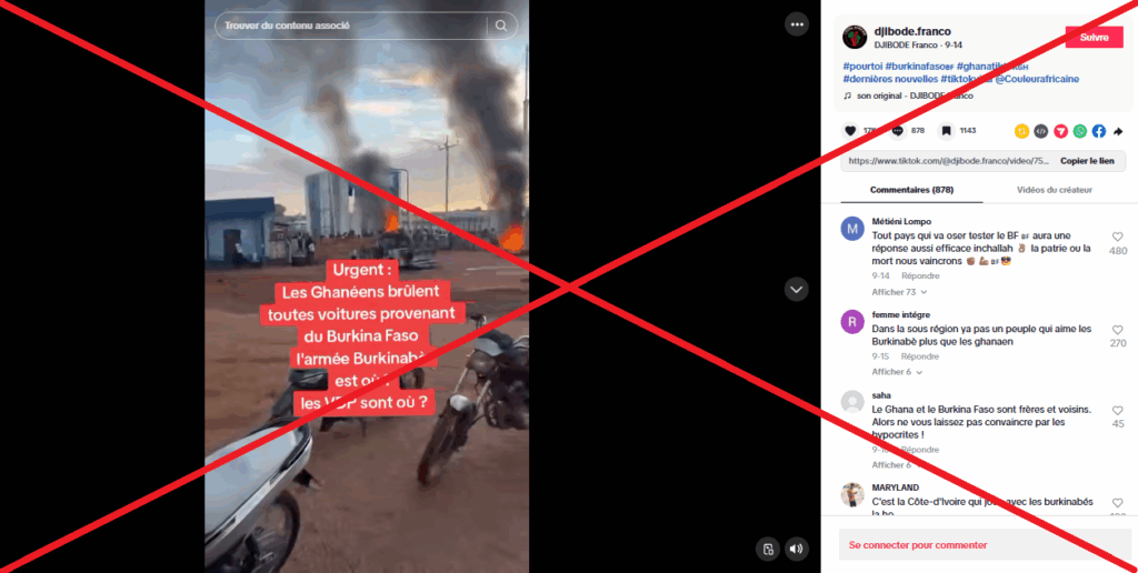 Publiée le 14 septembre 2025, par le compte tiktok @djibode.franco, la vidéo est titrée: “ Urgent : Les Ghanéens brûlent toutes voitures provenant du Burkina Faso, l’armée Burkinabė est où ? les VDP sont où ?”