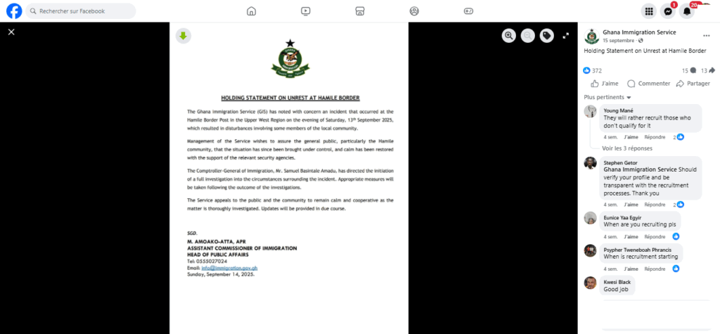 À la suite de ces événements, le service d’immigration du Ghana (Ghana Immigration Service – GIS) a publié un communiqué sur sa page Facebook le 15 septembre 2025 lié aux événements survenus au poste frontalier de Hamile.
