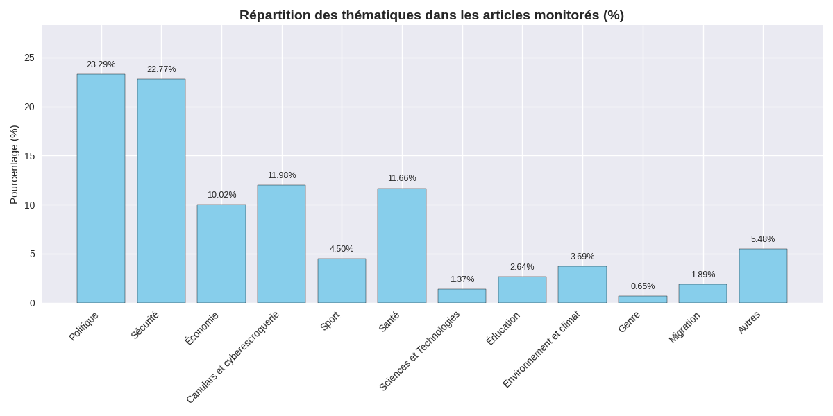Afin de classifier les articles analysés, une grille de lecture composée de douze thématiques a été élaborée. Ces catégories ont été définies de manière à couvrir l’ensemble des domaines récurrents dans le corpus étudié, tout en permettant une analyse comparative des tendances informationnelles. Les thématiques retenues sont les suivantes : Politique, Sécurité, Économie, Canulars et cyberescroquerie, Sport, Santé, Sciences et Technologies, Éducation, Environnement et climat, Genre, Migration, Autres.
