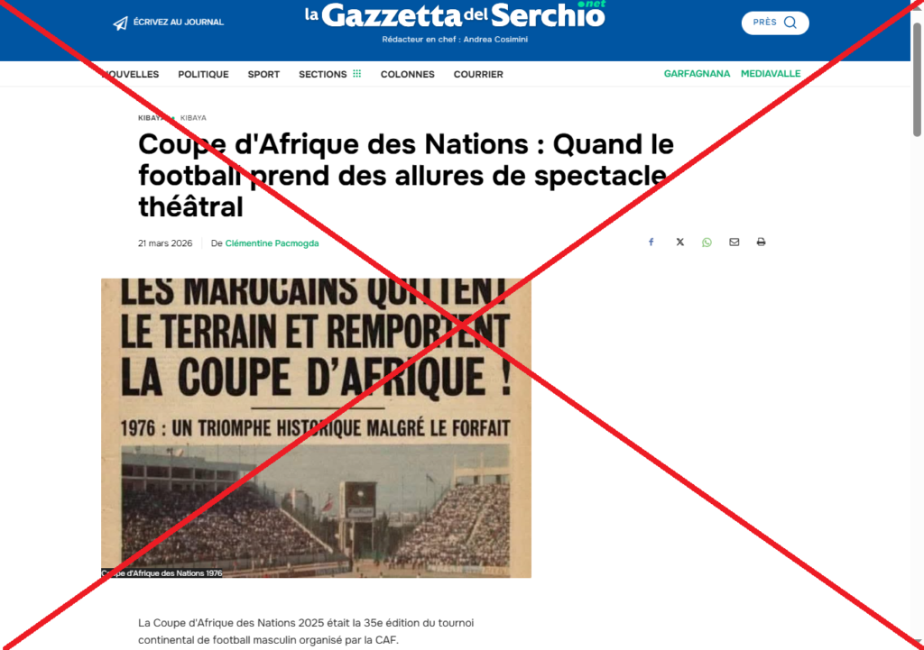 L’image a aussi servi d’illustration à un article du site italien La Gazzetta del Serchio, titré « Coupe d’Afrique des Nations : quand le football prend des allures de spectacle théâtral », publié le 21 mars 2026. Ce dernier revient sur la CAN 2025, remportée par le Sénégal, avant d’affirmer que la CAF aurait, le 17 mars 2026, attribué le trophée au Maroc sur la base d’une victoire 3-0 par forfait en finale, consécutive à un abandon temporaire du terrain par le Sénégal, alors que le score était de 1-0 après prolongation. L’article établit enfin un parallèle avec la CAN 1976, disputée en Éthiopie.