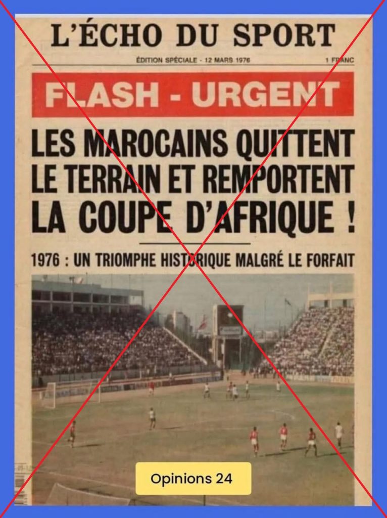 Une prétendue Une de journal intitulée « L’Écho du Sport », largement relayée sur les réseaux sociaux fin mars 2026, affirme qu’en 1976 le Maroc aurait remporté la Coupe d’Afrique des nations après un abandon du terrain face à la Guinée.