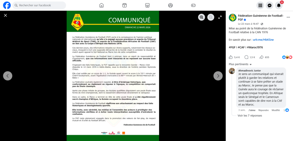 La Fédération guinéenne de football (FGF) a démenti ces rumeurs dans un communiqué publié le 22 mars 2026. Elle précise qu’aucune procédure n’a été engagée auprès du Tribunal arbitral du sport ni auprès de la Confédération africaine de football. Elle rappelle que le match s’est bien terminé sur un score de 1-1 et que le titre du Maroc a été régulièrement acquis conformément au règlement de l’époque. (Capture d’écran)