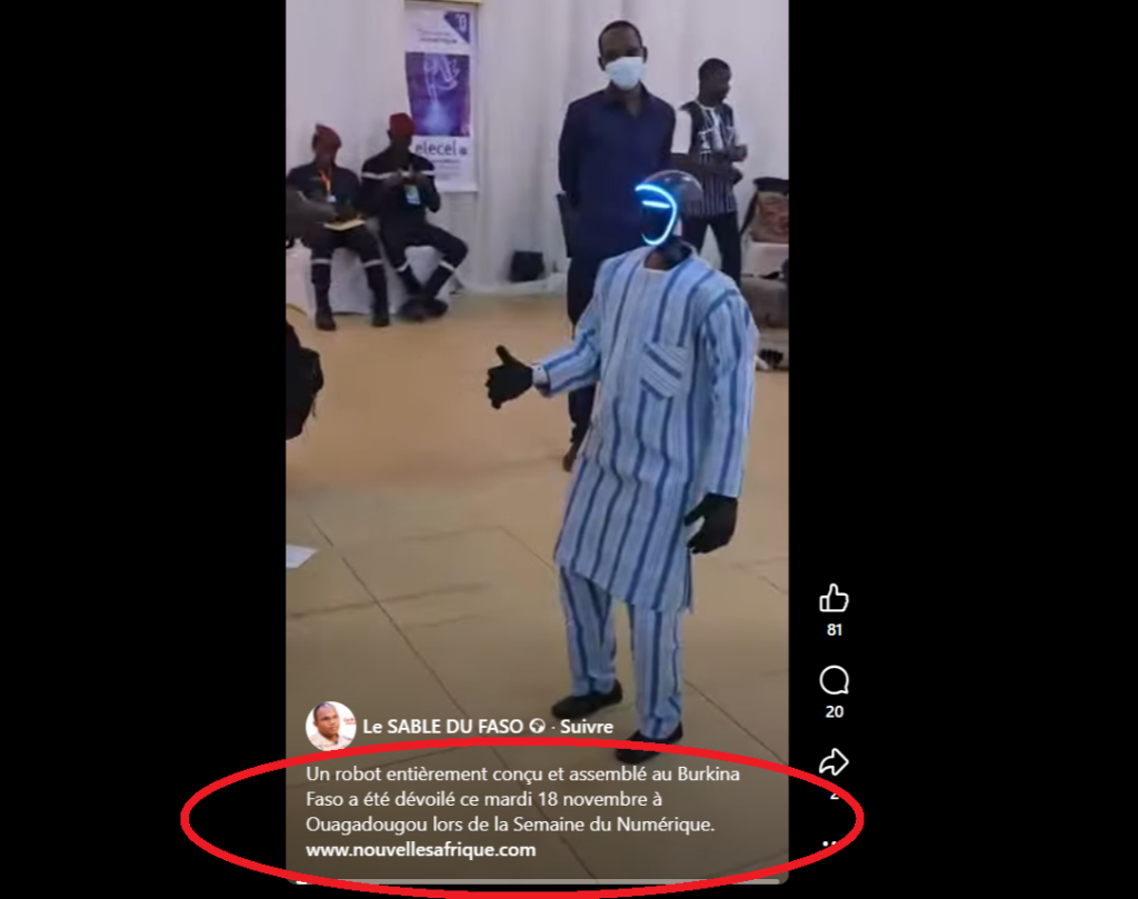 Une vidéo de 51 secondes diffusée le 18 novembre sur Facebook prétend montrer un robot humanoïde présenté à Ouagadougou, au Burkina Faso lors de la Semaine du Numérique. Le contenu de la vidéo indique que ce robot a été conçu et assemblé localement par une équipe d’ingénieurs burkinabè.