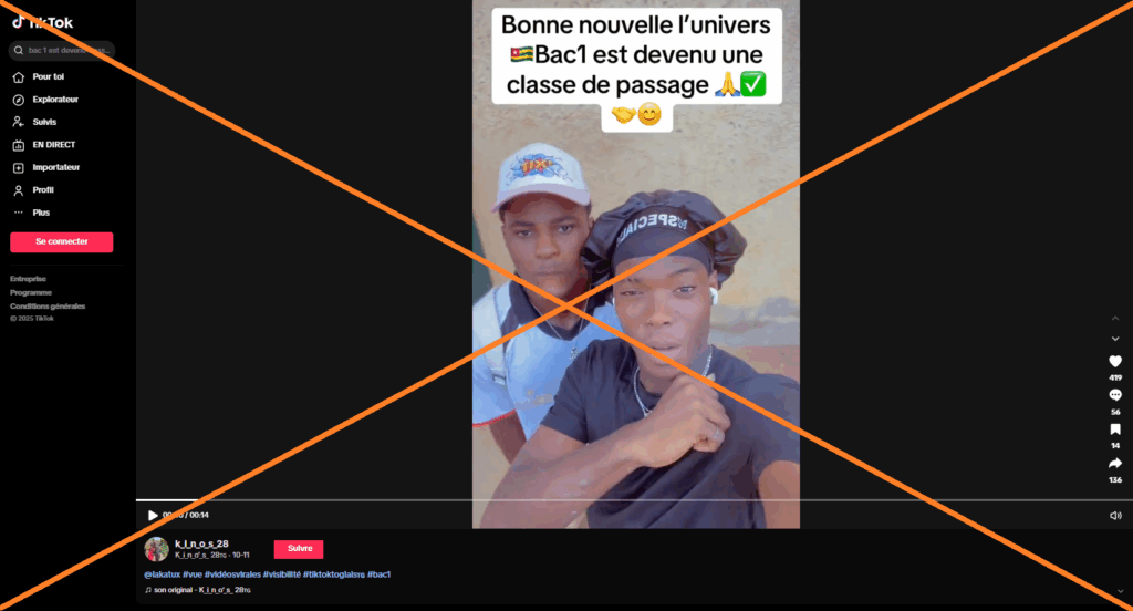 Une vidéo de 14 secondes publiée sur TikTok laisse croire que le probatoire est supprimé au Togo et que la Première est désormais une classe de passage. La vidéo montre deux jeunes garçons qui annoncent l’information en mina.