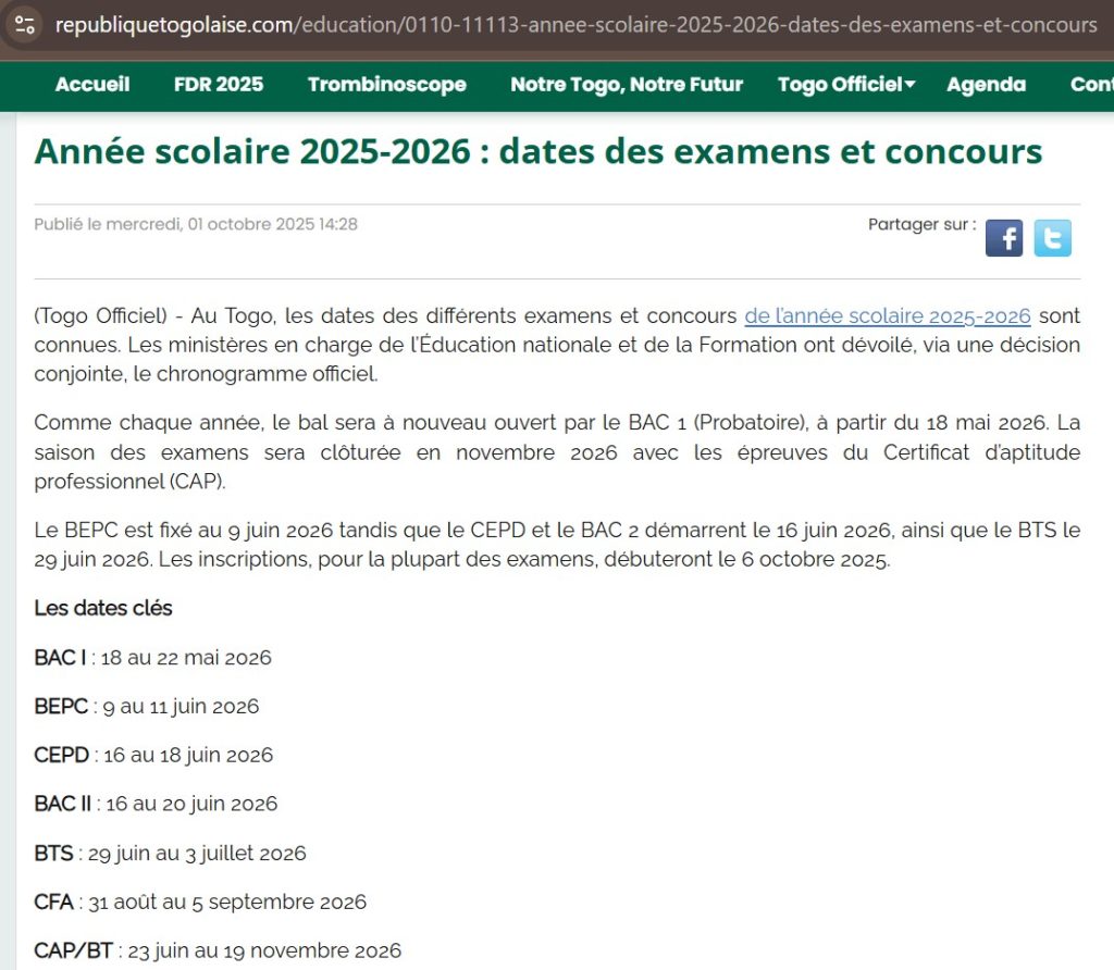 “ Au Togo, les dates des différents examens et concours de l’année scolaire 2025-2026 sont connues. Les ministères en charge de l’Éducation nationale et de la Formation ont dévoilé, via une décision conjointe, le chronogramme officiel. Comme chaque année, le bal sera à nouveau ouvert par le BAC 1 (Probatoire), à partir du 18 mai 2026. La saison des examens sera clôturée en novembre 2026 avec les épreuves du Certificat d’aptitude professionnel (CAP).” lit-on dans ledit article.