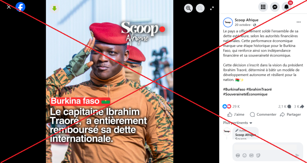 Le compte Facebook, Scoop Afrique a publié le 20 octobre 2025, une image sur laquelle on aperçoit le capitaine Ibrahim Traoré entouré de son protocole sécuritaire, avec comme légende : ‘’ Le capitaine Ibrahim Traoré à entièrement remboursé sa dette internationale’’. L’image est accompagnée du message : “Le pays a officiellement soldé l’ensemble de sa dette extérieure, selon les autorités financières nationales. Cette performance économique marque une étape historique pour le Burkina Faso, qui renforce ainsi son indépendance financière et sa souveraineté économique.