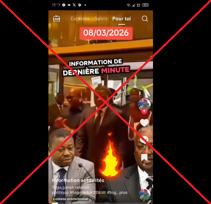 Publiée le 8 mars 2026 par le compte « Information Actualités », avec comme  légende : « Togo Ganah : relations politiques [sic]», la vidéo met en scène des images du dirigeant togolais et de son homologue ghanéen, John Dramani Mahama, accompagnées d’une voix synthétique.  Au 20 mars 2026, la vidéo avait été visionnée 1 598 fois et le compte de l’auteur totalisait 32 abonnements, plus de 10 000 abonnés et plus de 22 100 mentions “J’aime”.