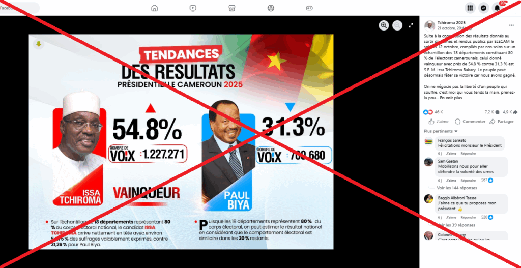 Nous avons également consulté le site officiel d’Elections Cameroon (ELECAM) et nous n’avons trouvé aucune trace du prétendu résultat annonçant la victoire du candidat Issa Tchiroma Bakary.