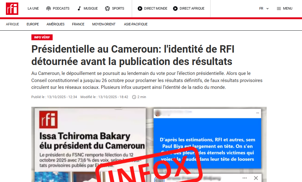 Ces résultats publiés par Issa Tchiroma Bakary, non validés par les autorités compétentes, ont été repris par certains internautes pour alimenter une campagne de désinformation. En usurpant le logo et la charte graphique de Radio France Internationale (RFI), ces publications laissent croire que le média avait annoncé la victoire du candidat. Ce qui n’est pas le cas.