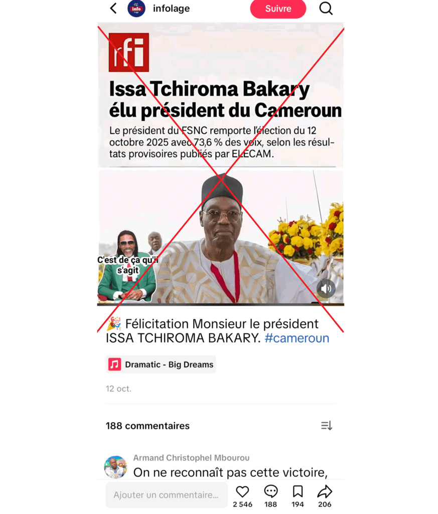 Une capture d’écran d’un article associée à un fond sonore partagés sur TikTok informe de la victoire de l’opposant Issa Tchiroma Bakary à l’élection présidentielle du 12 octobre 2025 au Cameroun. Il aurait remporté le scrutin avec 73,6 % des voix selon les résultats provisoires publiés par ELECAM. Le logo de RFI visible sur l’image laisse penser que l’information est communiquée par la radio internationale.