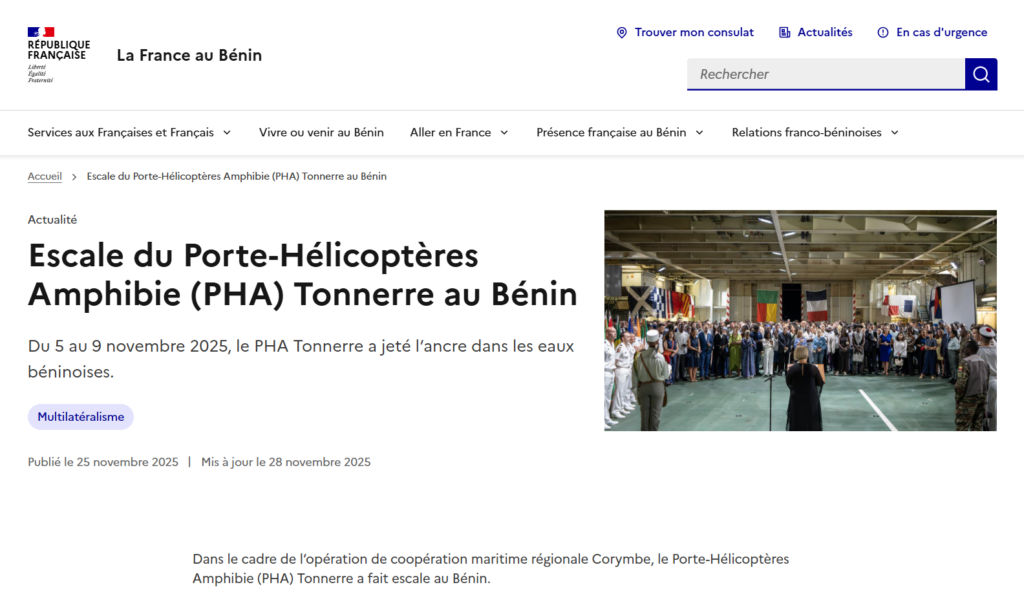 Capture d’écran réalisée le 21/01/2026 de l’article publié par l’Ambassade de France au Bénin suite à l’arrivée du PHA Tonnerre au Bénin