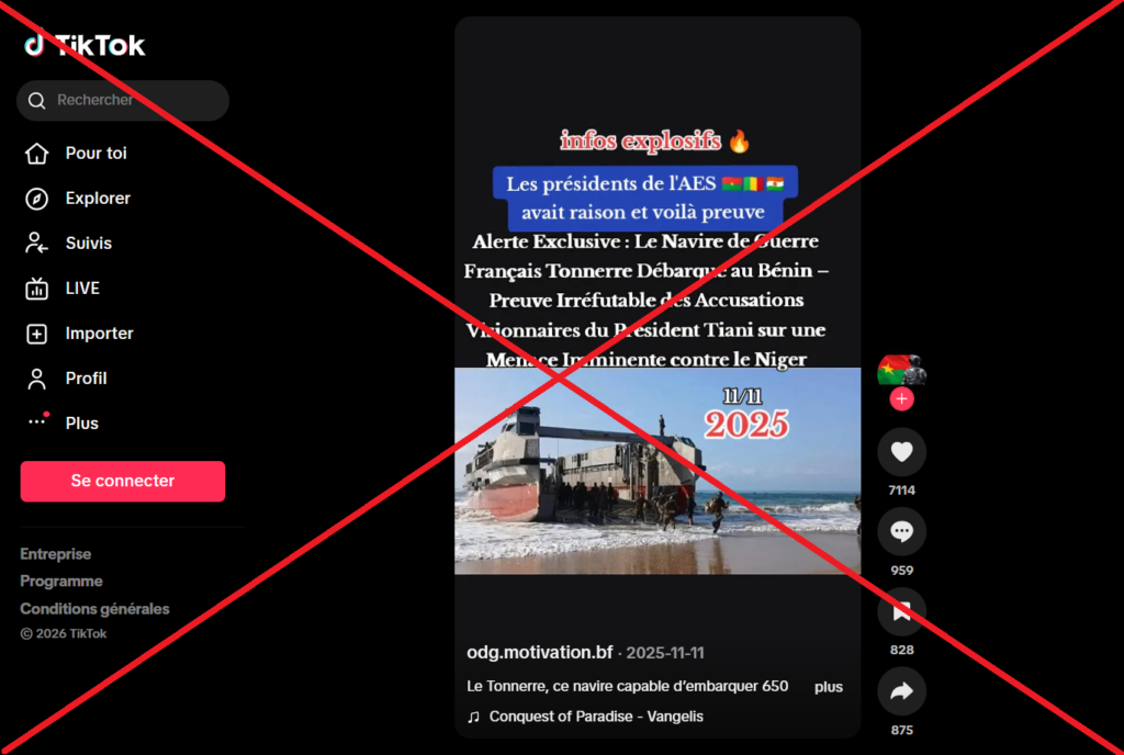 L’article est intitulé : « Alerte exclusive : Le navire de guerre français Tonnerre arrive au Bénin – preuve irréfutable des accusations visionnaires du président Tianyi concernant une menace imminente pour le Niger [sic]» et est illustré avec des images publiées en novembre 2025 sur la page Facebook de l’État‑Major Général des Forces Armées du Bénin. Il a également été repris le 10 novembre 2025 par l’internaute Ibrahima Maiga sur sa page Facebook.