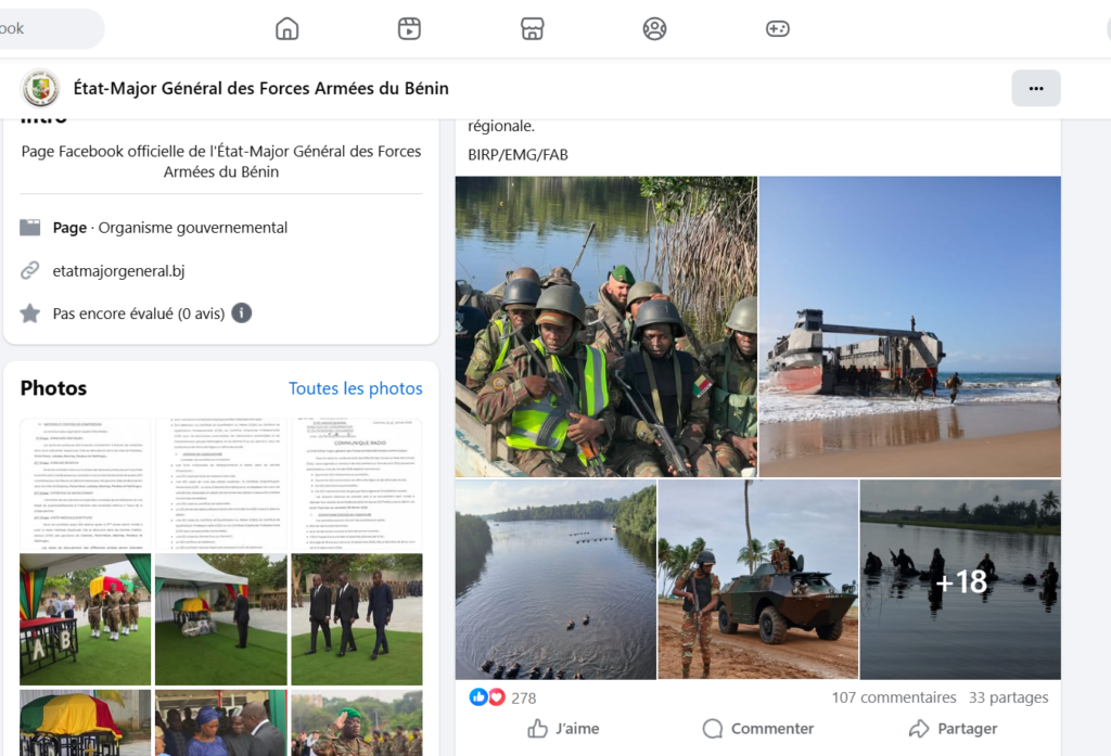 Capture d’écran réalisée le 21/01/2026 de la publication faite par l’État Major Général des F.A. du Bénin. L’image en haut à droite est celle reprise par la publication trompeuse sur TikTok que nous vérifions