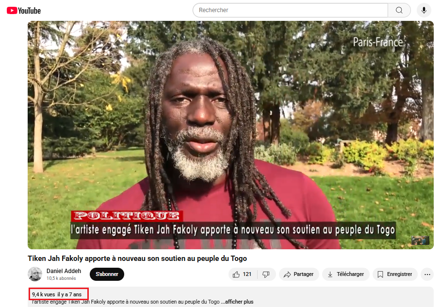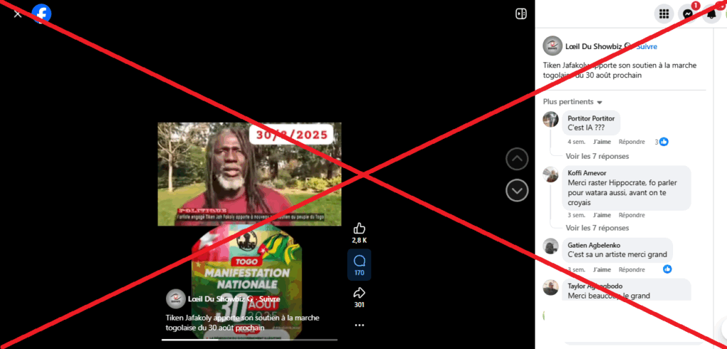 La vidéo cumule au 26 septembre 2025 plus de 2800 mentions “j’aime” et 300 partages. Plusieurs comptes sur Facebook, YouTube et Instagram ont relayé cette vidéo avec le même commentaire : celui du soutien de Tiken Jah Fakoly à la manifestation du 30 août 2025 à Lomé.