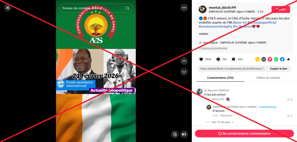 La vidéo en question a été publiée le 22 février 2026 par le compte TikTok @mental_declic99. D’une durée de 14 minutes et 42 secondes, elle est accompagnée de la légende : « L’AES avance, la Côte d’Ivoire classée 2ᵉ des pays les plus endettés auprès du FMI ».