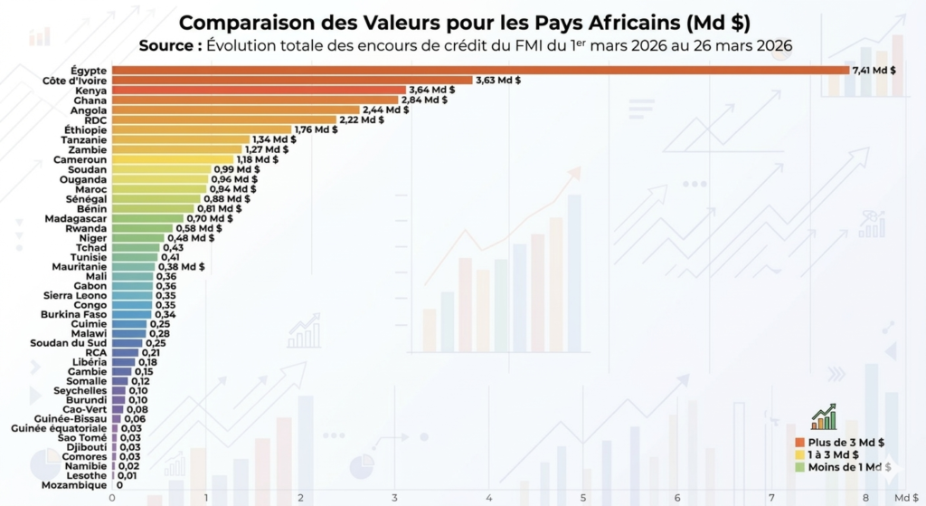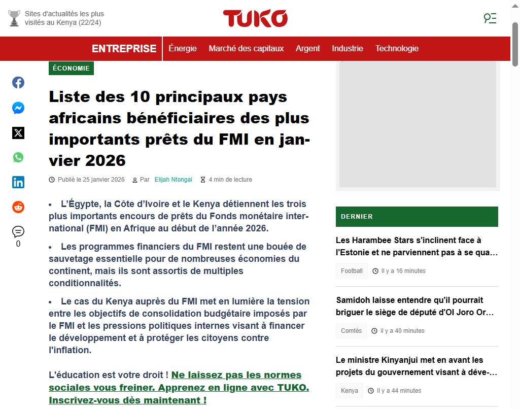 La recherche a également permis d’identifier plusieurs autres médias en ligne ayant publié la même information courant février 2026. C’est le cas du média en ligne, La Nouvelle Tribune. On peut y lire : « Au 20 février 2026, l’Égypte totalise 5,89 milliards de dollars de prêts (équivalent DTS), plaçant le pays en tête du classement africain. La Côte d’Ivoire suit avec 3,63 milliards, puis le Kenya (2,94 milliards), le Ghana (2,84 milliards) et l’Angola (2,50 milliards).»