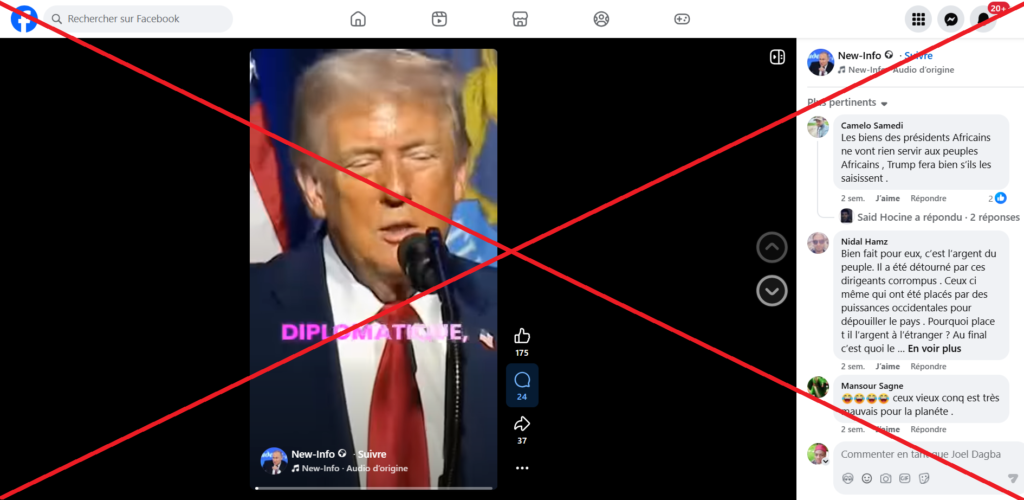 Mais, déjà le 20 décembre 2025 et le 8 janvier 2026, deux pages Facebook avaient publié un message similaire affirmant que Donald Trump « crée la panique » en menaçant de saisir les biens de dirigeants africains. Et, selon les commentaires sous ces publications, de nombreux internautes apprécient le positionnement de Donald Trump et soutiennent son projet.