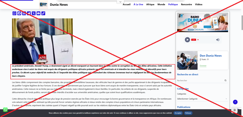 Selon un article publié le 12 mars 2026 sur son site internet, le média annonce que « Le président américain Donald Trump a récemment signé un décret marquant un tournant dans la lutte contre la corruption en Afrique. Cette nouvelle mesure, qui vise à saisir les biens mal acquis des dirigeants africains aux États-Unis, pourrait avoir des conséquences importantes pour les élites politiques du continent. En effet, les comptes bancaires, villas, véhicules de luxe et yachts des dirigeants soupçonnés de corruption seront désormais confisqués, à moins qu’ils ne puissent justifier l’origine légale de leurs richesses. » Et pourtant, l’article ne cite aucune source crédible d’où l’information a été tirée, ni le décret en question portant sur cette confiscation.