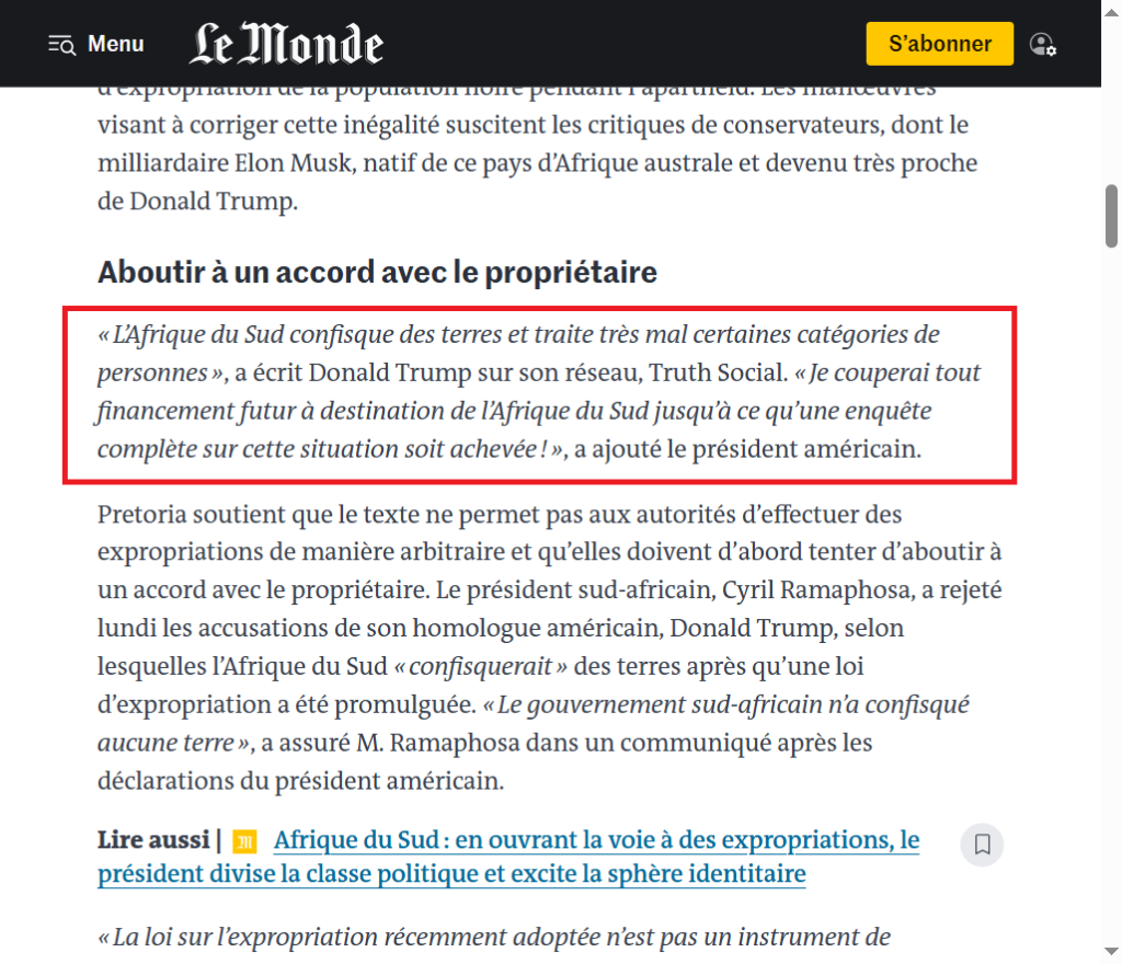Pour corroborer ses propos, l’auteur de la vidéo précise, « Ce n’est d’ailleurs pas la première décision controversée du président américain sur le continent. En février 2025, Donald Trump avait déjà accusé l’Afrique du Sud de confisquer des terres.