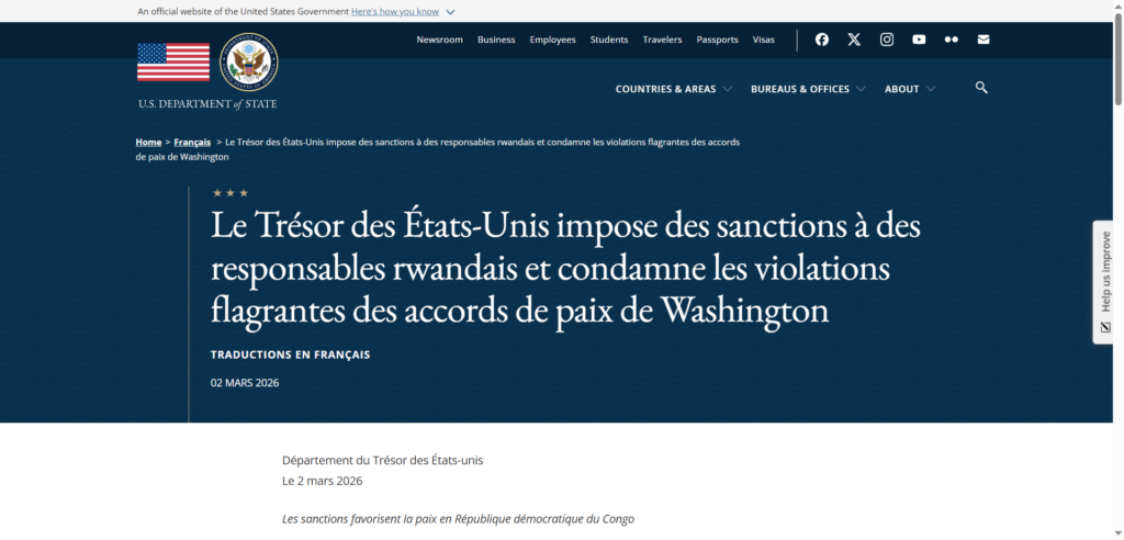 Par ailleurs, le 2 mars 2026, le département du Trésor des États-Unis a imposé des sanctions contre la force de défense du Rwanda (RDF) et quatre de ses hauts responsables, accusés de soutenir activement le groupe rebelle M23 dans l’est de la République démocratique du Congo, contribuant à l’instabilité et aux violations des accords de paix.