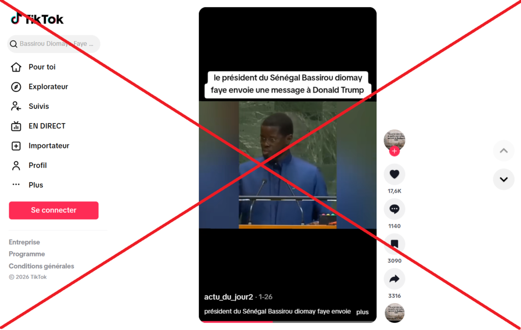Une vidéo d’une minute 10 secondes, diffusée sur TikTok par le compte actu_du_jour2, le 26 janvier 2026 prétend que le président sénégalais Bassirou Diomaye Faye est prêt à faire la guerre avec les États-Unis si le président américain Donald Trump ne laisse pas entrer les supporters de l’équipe de football sénégalaise aux États-Unis lors de la Coupe du monde 2026.