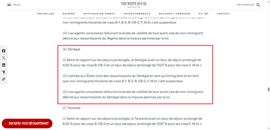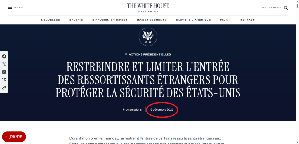D’après nos recherches, le décret « restreignant et limitant davantage l’entrée des ressortissants étrangers afin de protéger la sécurité des États-Unis » a été rendu public le 16 décembre 2025, soit deux mois et 22 jours après le discours de Diomaye Faye, ce qui est incohérent.